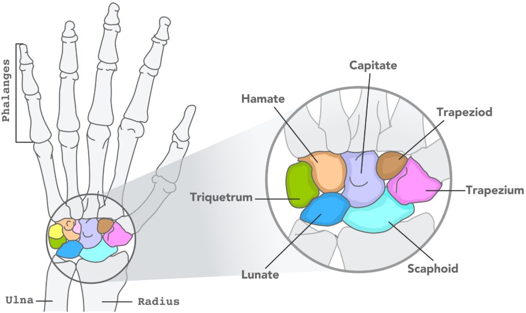 The wrist comprises multiple small bones and joints, making it susceptible to post-traumatic and degenerative changes.